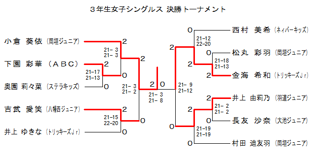 | 3GS-9 | トリッキーズJr | 金海 希和 | 2 | 21- 9 21-12 | 0 | 井上由莉乃 | 羽道Jr. | |