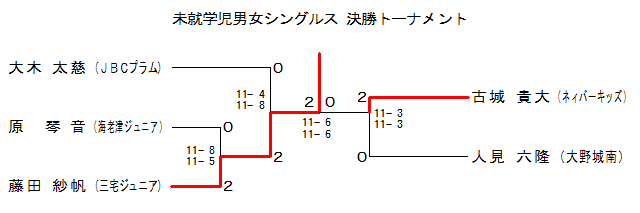 | 未就学児男女シングルス 3ブロック | 古城 | 大迫 | 村坂 | 順位 |