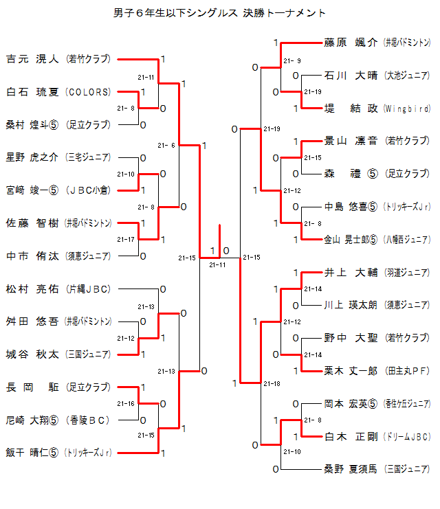 | 6BS-26 | 若竹C. | 吉元 滉人 | 1 | 21-11 | 0 | 井上 大輔 | 羽道Jr. | |