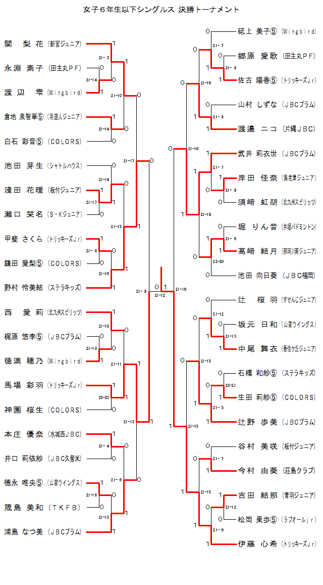 | 6GS-36 | ステラキッズ | 野村怜美結 | 1 | 21-17 | 0 | 関 梨花 | 新宮Jr. | |