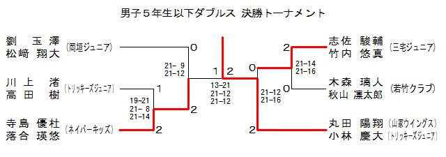 | 5BD-5 | 山家ウイングス・トリッキーズJr. | 丸田 陽翔・小林 慶大 | 2 | 13-21 21-12 21-12 | 1 | 寺島 優杜・落合 瑛悠 | ネイバーキッズ | |