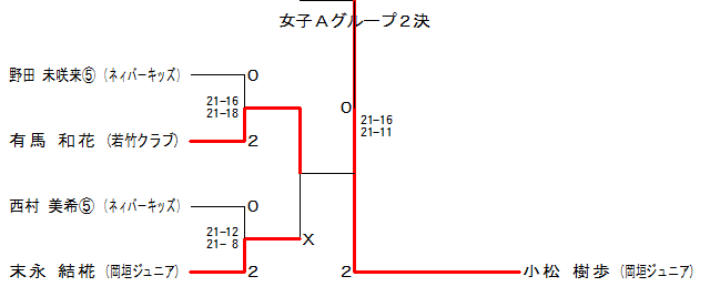 | GA2-2 | 岡垣Jr. | 末永 結椛 | 2 | 21-12 21- 8 | 0 | 西村美希D | ネィバーキッズ | |